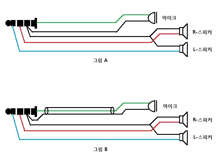 일반적으로 시중에서 구입하는 이러한 이어셋은 그림 A와 같은 구조 입니다.