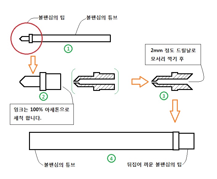 2. 2mm 드릴 팁: 볼펜팁의 뒷쪽을 날카롭게 모서리 가공하는데 사용합니다.