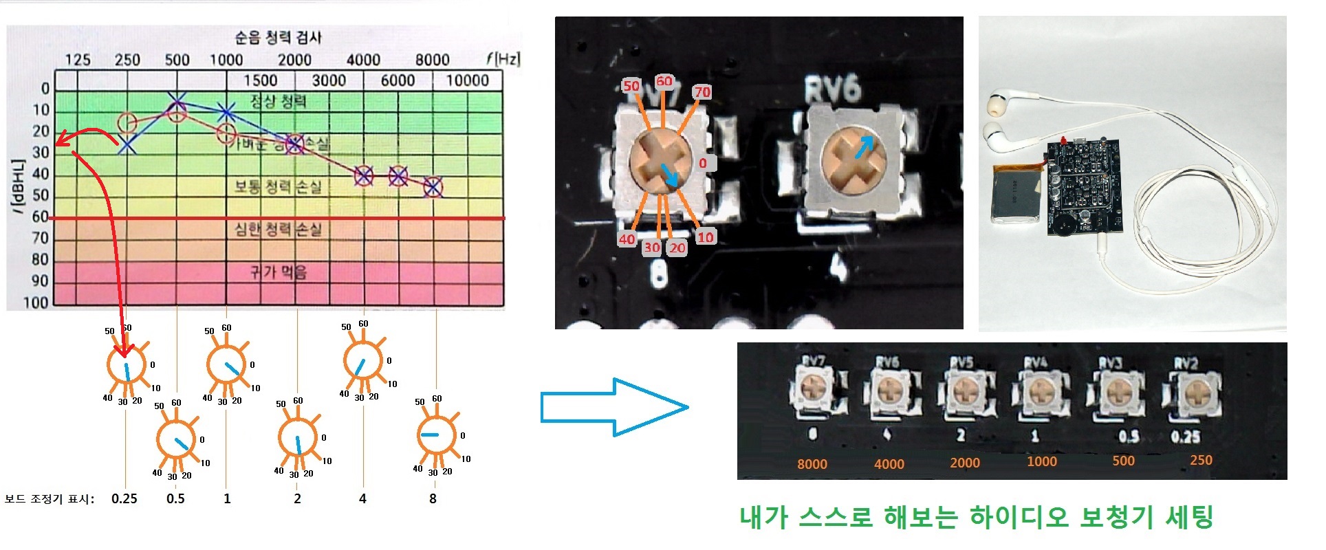 순음청력검사 도표에서 상단의 8000 위치 수직선 상의 "X" 표시 위치에 해당하는 좌측 눈금의 숫자를 읽으면 45가 됩니다. 하이디오 보청기 보드 뒤면에 8로 인쇄된 RV7 조정기에서 가상으로 그려본 스케일의 45 위치에 조정기 포인트를 맞춥니다.