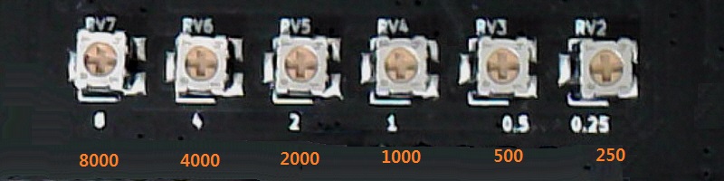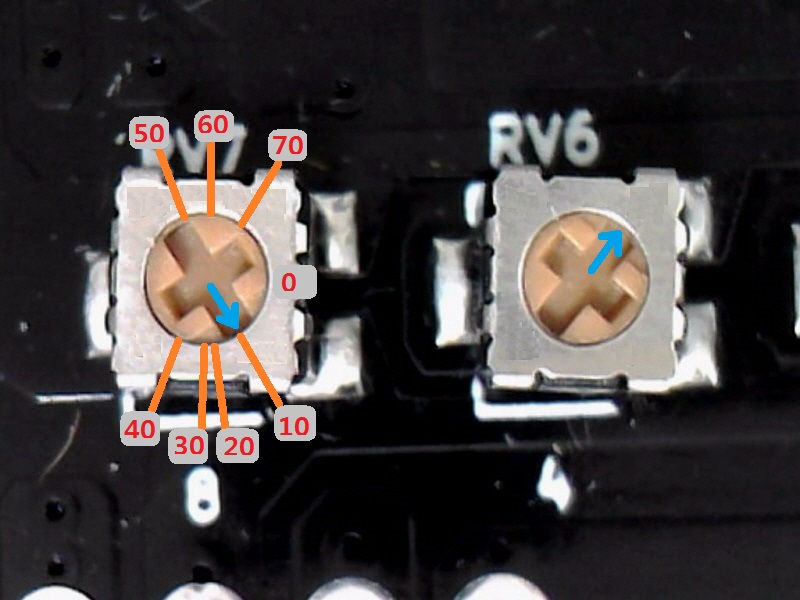 좌측의 조정기("8" 로 인쇄; RV7)는 반시계 방향으로 최소로 세팅한 모습입니다.