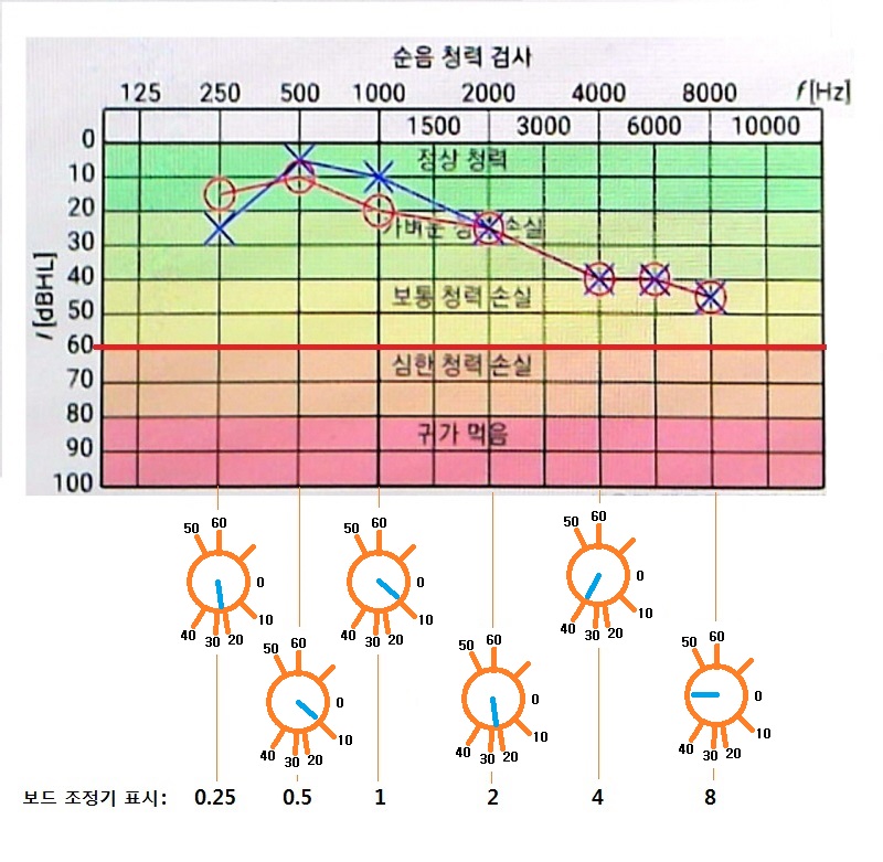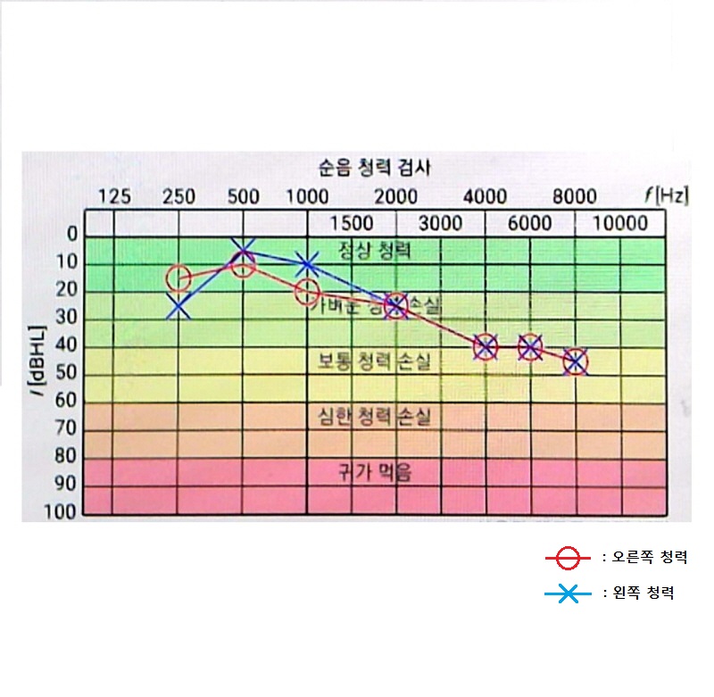 도표에서 좌측 귀 청력 그래프를(파랑색 "X" 표시) 기준으로 설명하겠습니다.