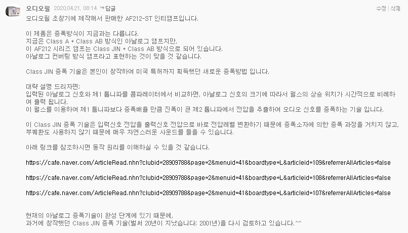 이 AF212 시리즈 앰프는 Class JIN + Class AB 방식으로 되어 있습니다.