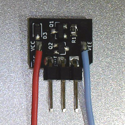 보드 우측에 VEE 로 적힌 곳이 -전원 단자 입니다. 이 -전원 단자에는 하늘색 와이어와 아래 3핀 단자의 맨 오른쪽 핀(핀번호는 1번핀 입니다; 보드의 모퉁이가 절단되어 있습니다)과 연결되어 있습니다.