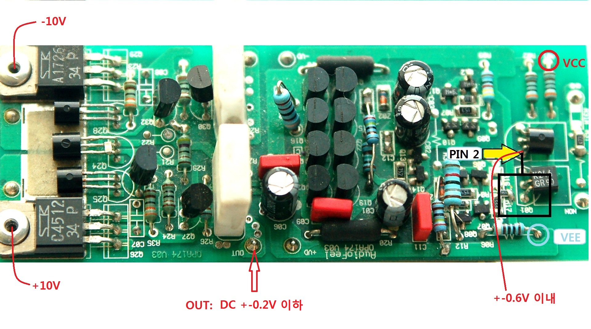 4-4. 입력단 Q02의 1번 단자 전압: +-0.6V 이내가 정상입니다.