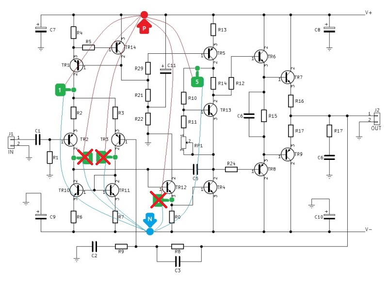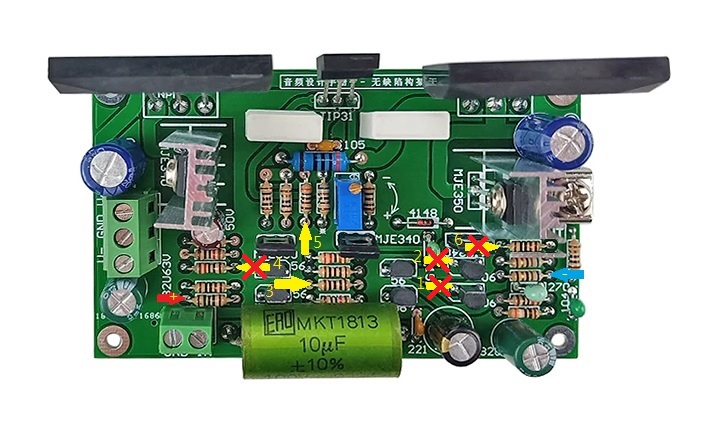 실제 앰프보드에 매직트라이오드를 설치하는 위치를 표시했습니다.